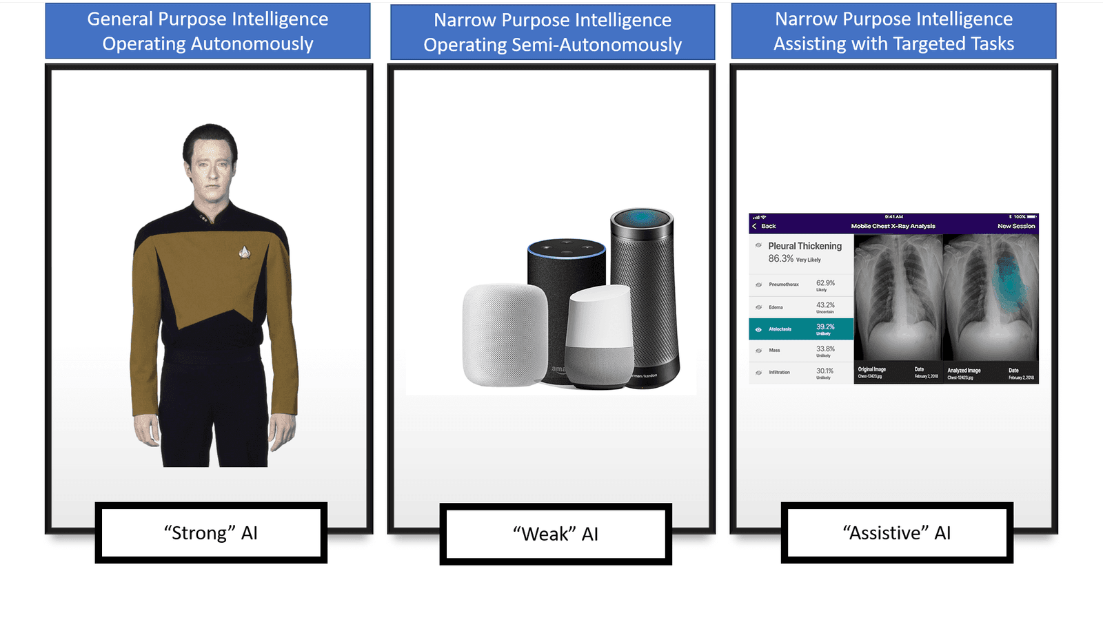 Past the “strong” AI is a simpler, more focused version that can be described as a “weak” model of artificial intelligence: it operates autonomously like our movie android would but is narrow of purpose. It’s capable of simple adaptation and learning within the confined realm which it operates. These systems are experts in things that are designed into them but don’t have any capacity to learn new tricks on their own. We interact with them every day by name: Siri, Alexa, Google. We ask them to roll up the windows on our cars, or to stay somewhat distant from the car in front of us. And although we can ask them questions about the weather that they can probably answer, they’re unlikely to give us sage advice about our relationships like Lieutenant Commander Data might.