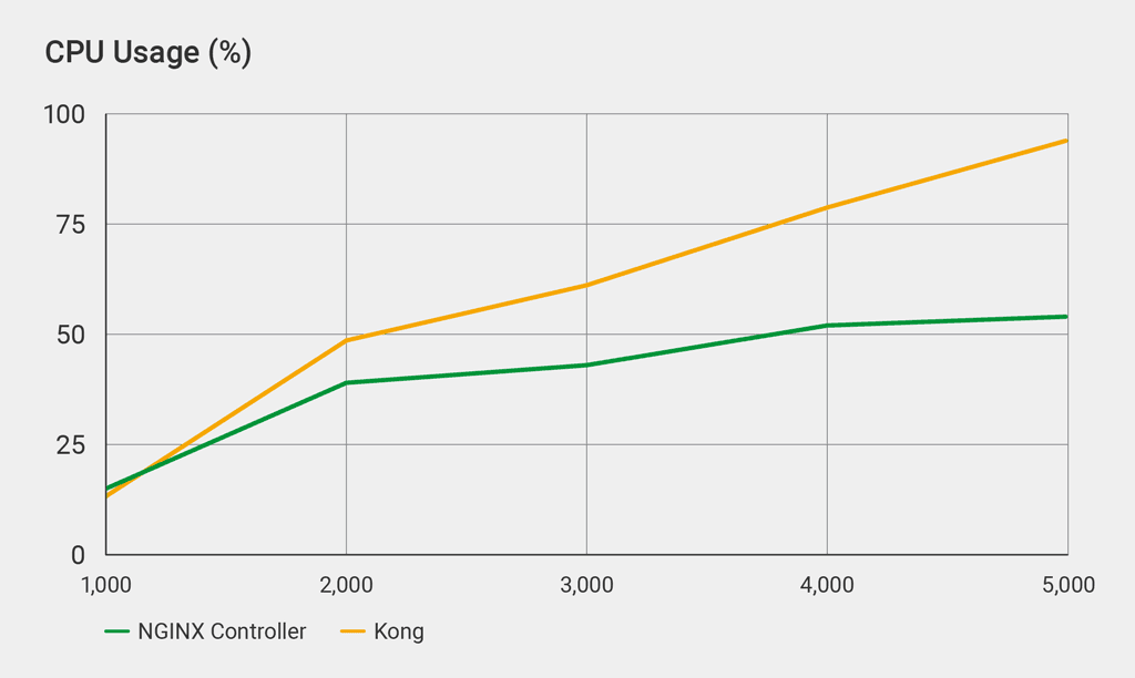 Kong effectively caps out at 5,000 API calls per second – latency spikes noticeably at call volumes any higher than that, indicating the system is fully loaded. At 5,000 calls per second, CPU usage is 93%, 73% higher than the API Management Module.