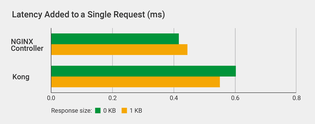 Kong increases latency compared to the API Management Module: by 44% for a 0-KB file and 24% for a 1-KB file.
