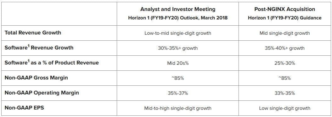F5 provided the following regarding its Horizon 1 (fiscal year 2019 to fiscal year 2020) outlook, following the completion of the NGINX acquisition: